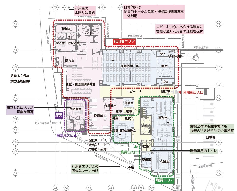 高齢者の生活スペースとして、だだっ広い単なる空間ではなく、イスとテーブルで会話できるスペース、畳でくつろぐスペース、体を動かせるスペースなど、様々な居場所を計画しています。それぞれは視線がつながることで、スタッフの目が行き届きやすく手厚いサービスを提供できることと、高齢者同士が他の人の活動を見て刺激を受けて、お互いに活力を刺激し合えるように計画しています。