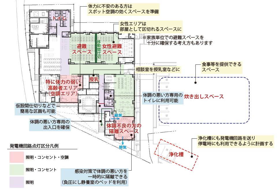 高齢者のための避難所として、感染症対策として体調が悪い方を一時的に隔離できるなどあらかじめ想定して計画をしております。台風の際などにも安心して避難ができる場を計画しております。