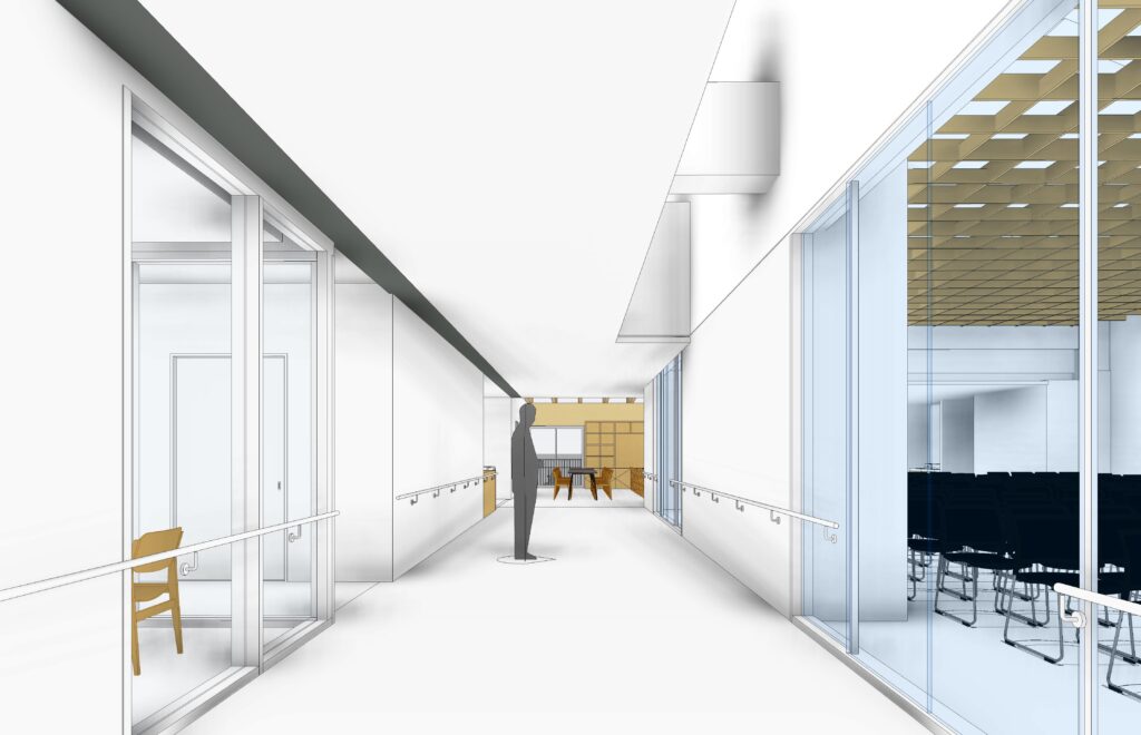 左の図のようにロビー廻りは天井は、設備も目立たないような形でできるだけすっきりさせたいなと思っています。
