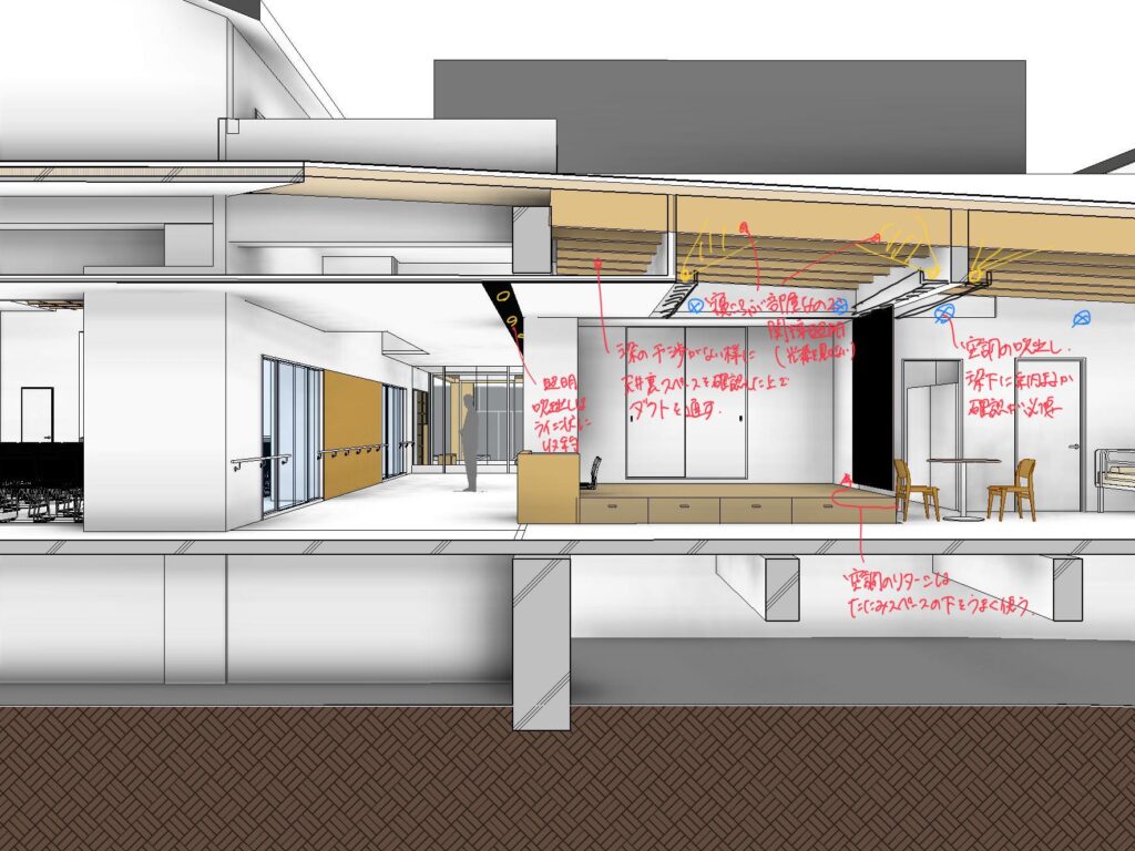 設備が通るスペースを確認しながら検討を進めています。