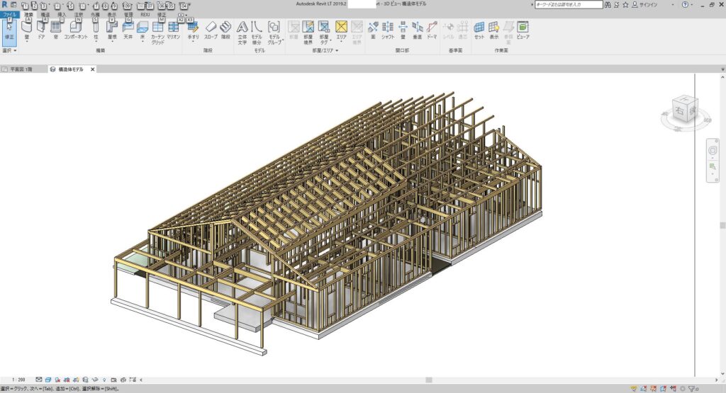 設計でBIMで骨組みや間柱も入力していましたので、このように立体で立ち上がります。