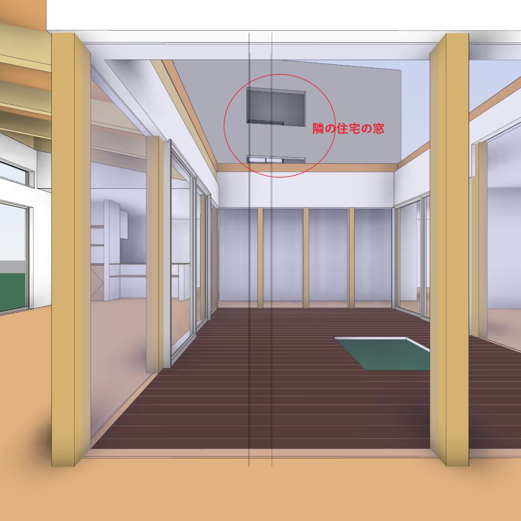 左のパースにあるようにリビングからは、隣の集合住宅の窓は見えません。