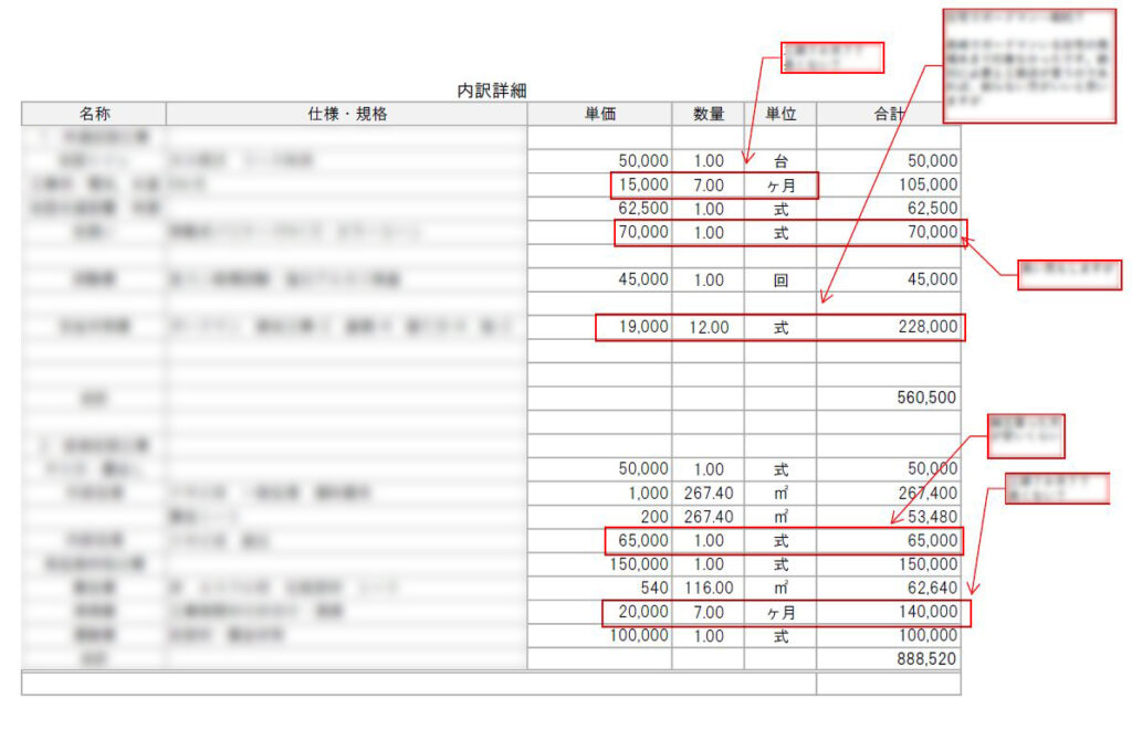 内訳が上がってきて、数量・価格を見ながら、一つ一つ妥当なのか、高いのか、安いのかなどを見ていきます。