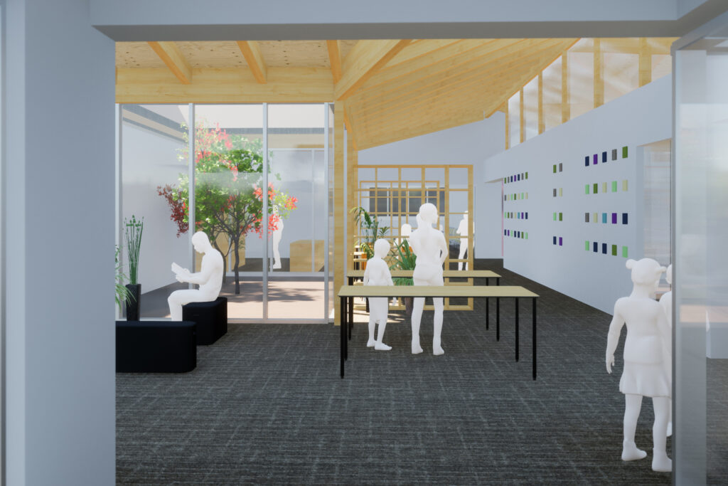 こうして見ると、左側の中庭には15時くらいから日射が差し込んでくるので、植栽を植える計画としています。